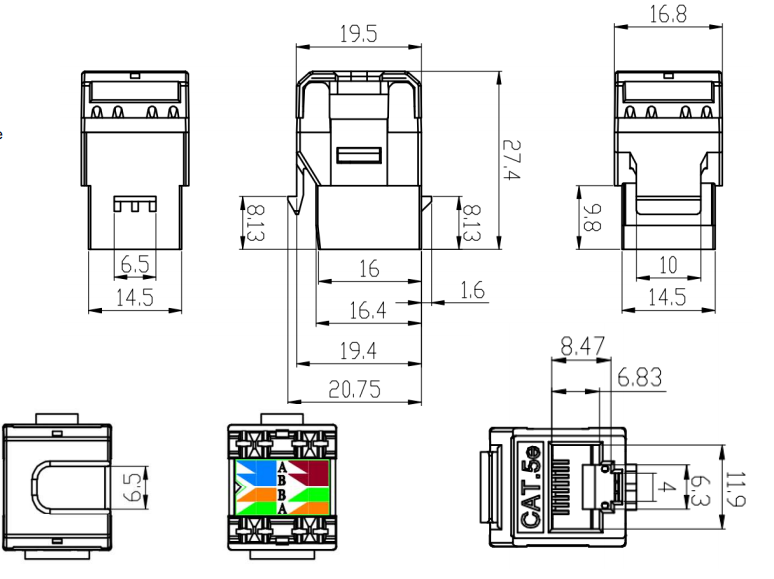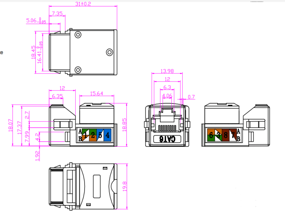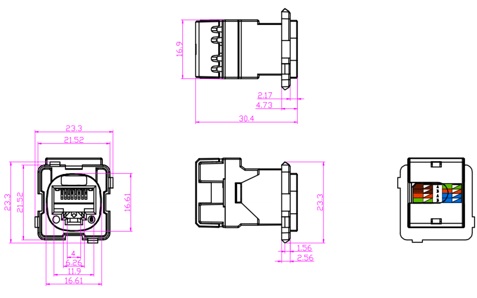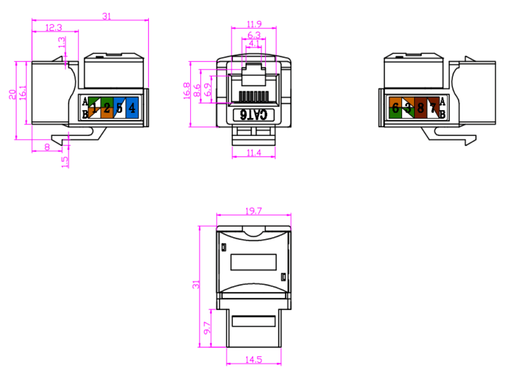 Kulay ng coding: Ang mga jack ng Keystone ay madalas na nagtatampok ng mga scheme ng mga naka-code na mga kable upang matiyak ang wastong pagkakahanay at pagtatapos ng mga cable na tanso. Ang color-coding ay sumusunod sa mga pamantayan sa industriya, tulad ng T568A o T568B, upang mapanatili ang pagkakapare-pareho at pagiging tugma sa loob ng sistema ng paglalagay ng kable.